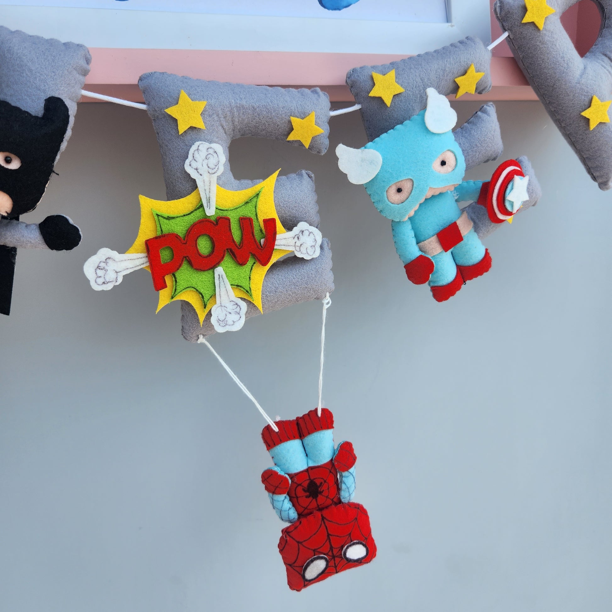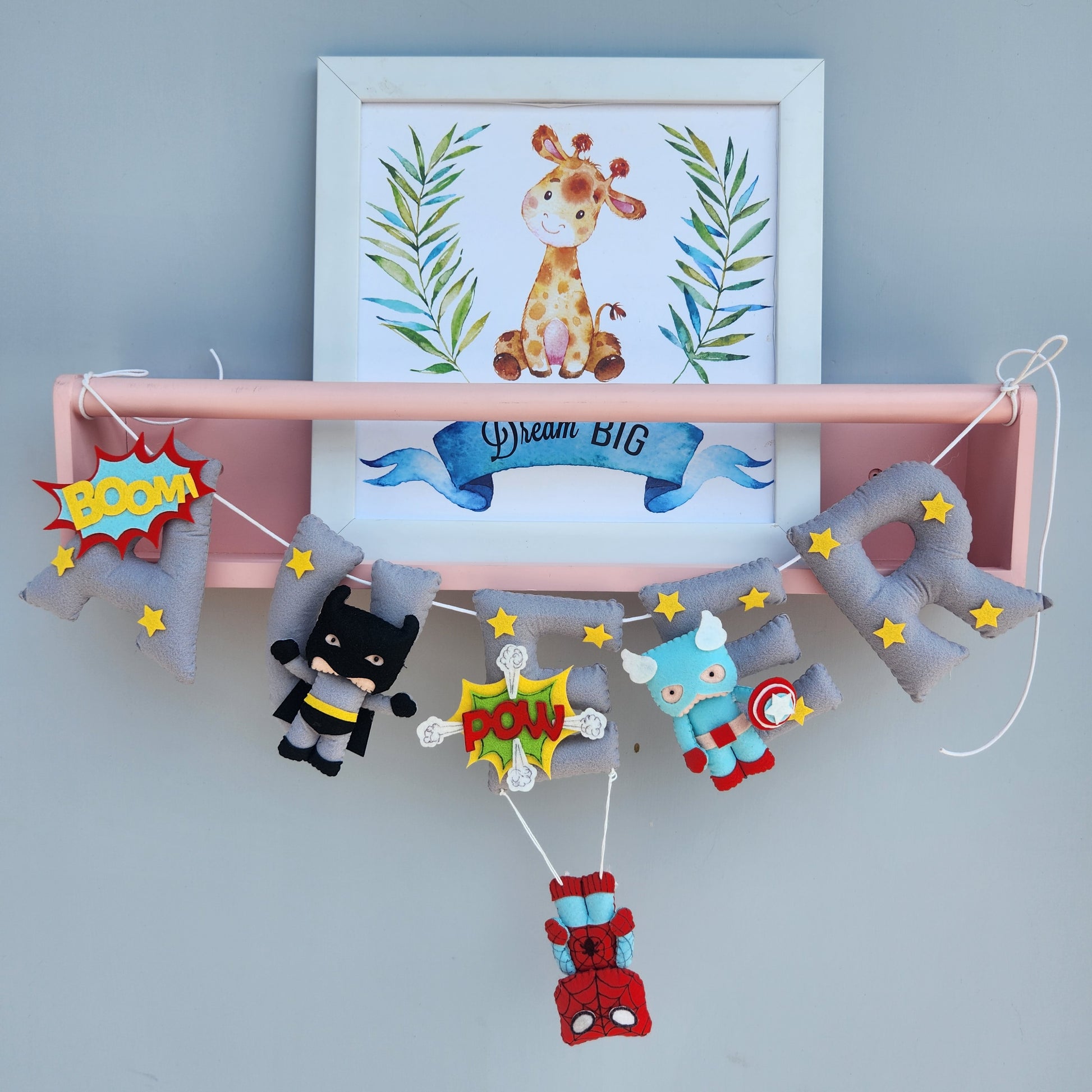 Our personalized superhero theme name bunting is perfect to hang on a wall shelf or a cot , crib. Can also be used as a birthday banner. These are beautifully handmade.