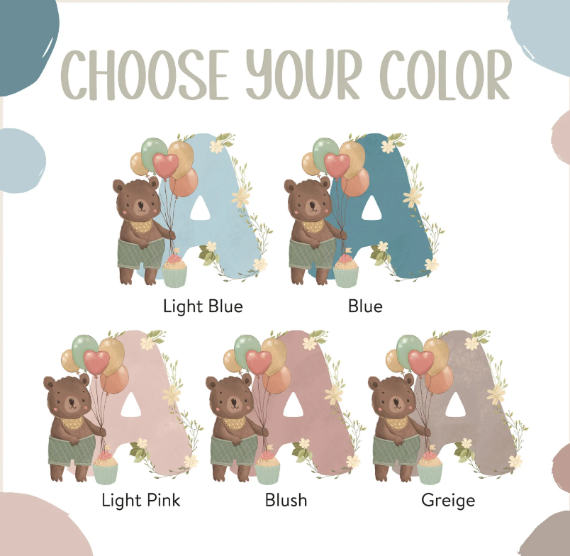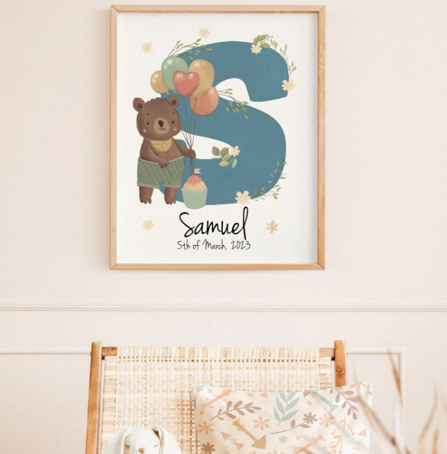 This personalized name initial poster is the perfect addition to any nursery or child's room, and makes a great baby shower or birthday gift. Each poster is customized with the child's initial and birth date, making it a unique and special keepsake. The soft watercolor design features an adorable teddy bear holding balloons, while the initial’s color can be customized. Order now and create a special memory that will last a lifetime!