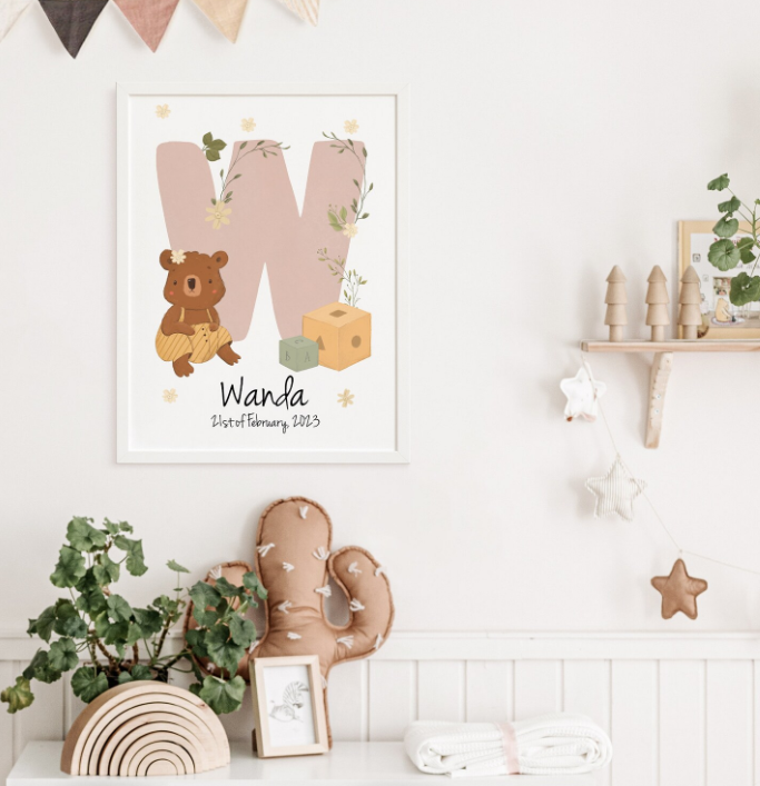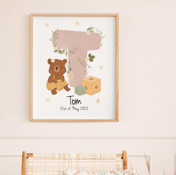 This personalized name initial poster is the perfect addition to any nursery or child's room, and makes a great baby shower or birthday gift. Each poster is customized with the child's initial and birth date, making it a unique and special keepsake. The soft watercolor design features an adorable teddy bear holding balloons, while the initial’s color can be customized. Order now and create a special memory that will last a lifetime!