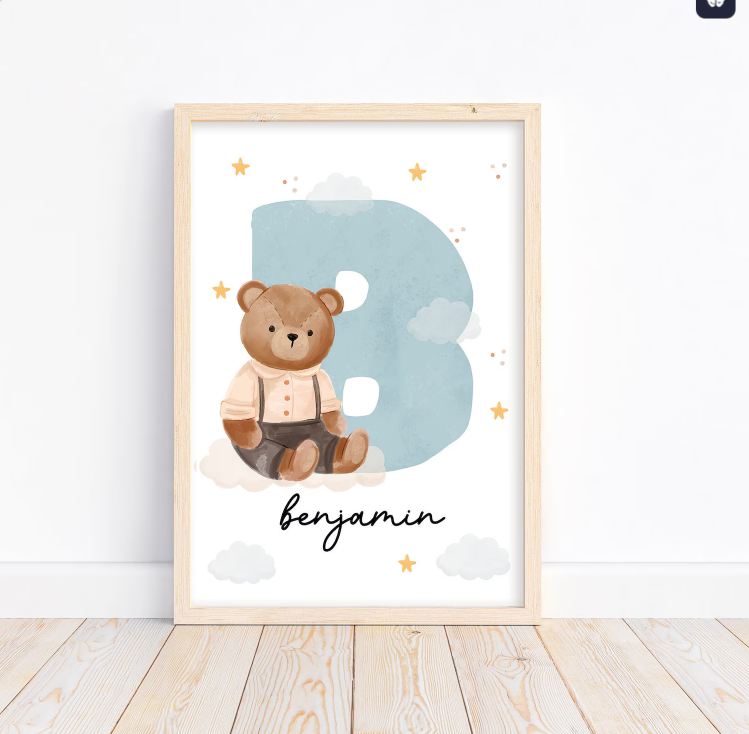 Introducing our adorable personalized name initial poster featuring a cute teddy bear with clouds and stars in the background! This high-quality printable poster is the perfect addition to any child's room or nursery. With your child's initial in a fun and playful font, surrounded by the charming bunny and whimsical background, this poster is sure to add a touch of magic and wonder to their space. Instantly download and print at home or at your favorite print shop for a personalized touch. Give the gift of personalized art and love to the little ones in your life with this delightful teddy bear poster.