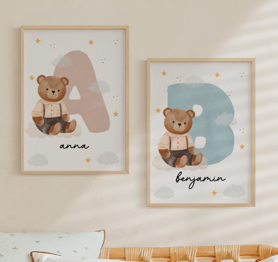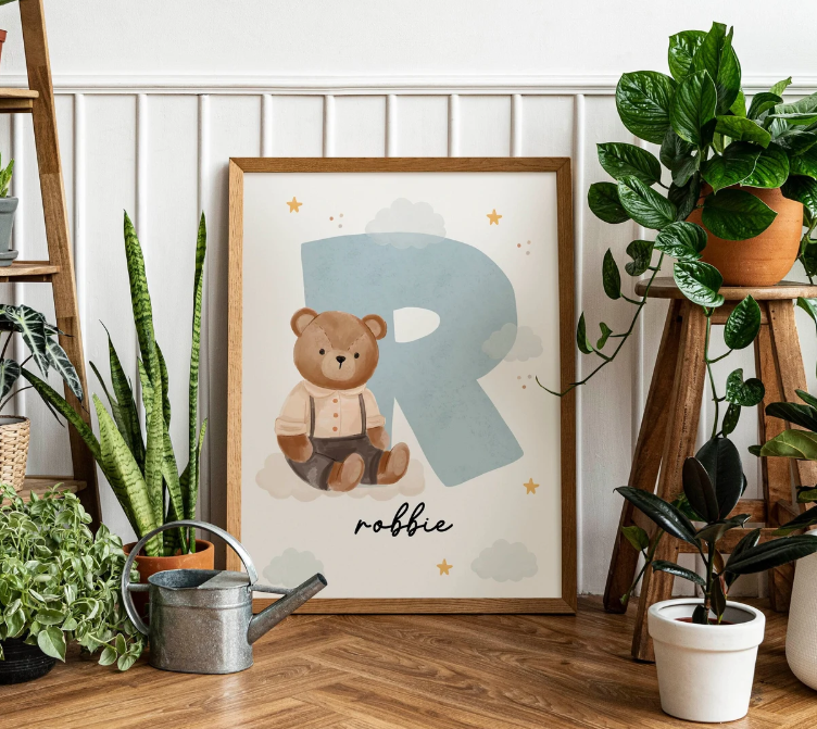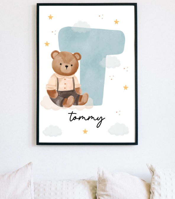 Custom Teddy Bear Name Initial Poster | Personalized Nursery Decor
