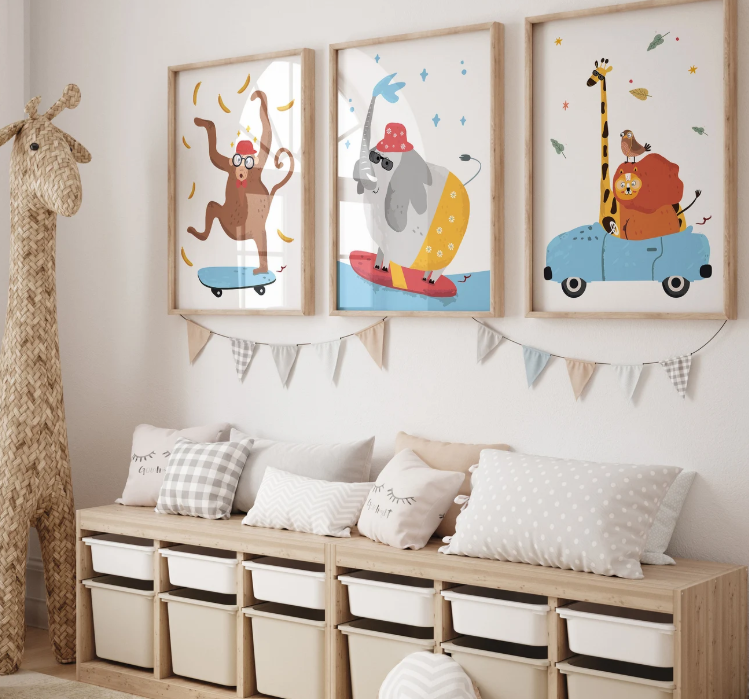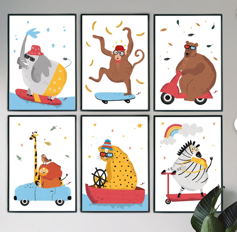 Bring the beauty of the animal kingdom to your child's space with this delightful set of six printable posters! Each poster features a playful and charming animal design, including a cool monkey on a skateboard, a fun-loving lion and giraffe in a blue convertible, a zebra on a scooter, a cheetah sailing on a small boat under a starry night sky, a cool bear riding a red scooter with 3D glasses, and a funny elephant surfing in the ocean wearing sunglasses and a bucket hat.
