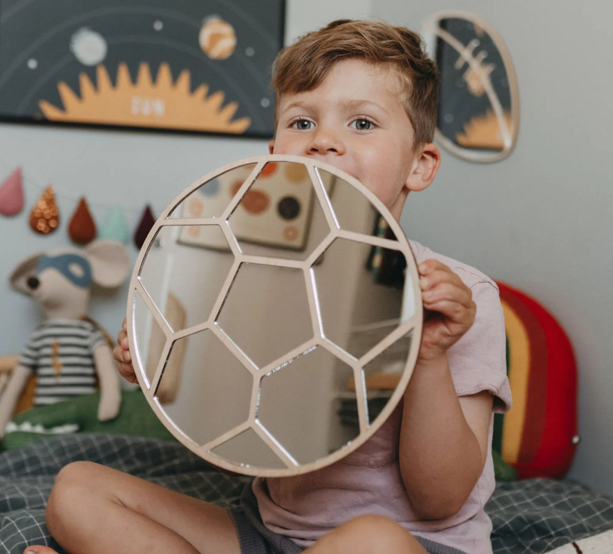 Score big in your child's room with our football shaped mirror! Perfect for sports enthusiasts, it adds a sporty touch to their space while reflecting their winning spirit with every glance. It's shatterproof and crafted from mirrored acrylic inset into a plywood frame.