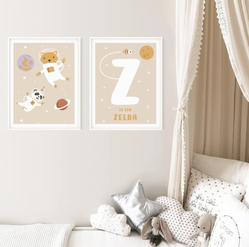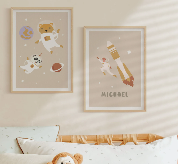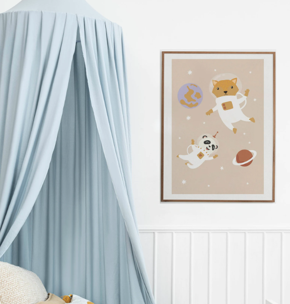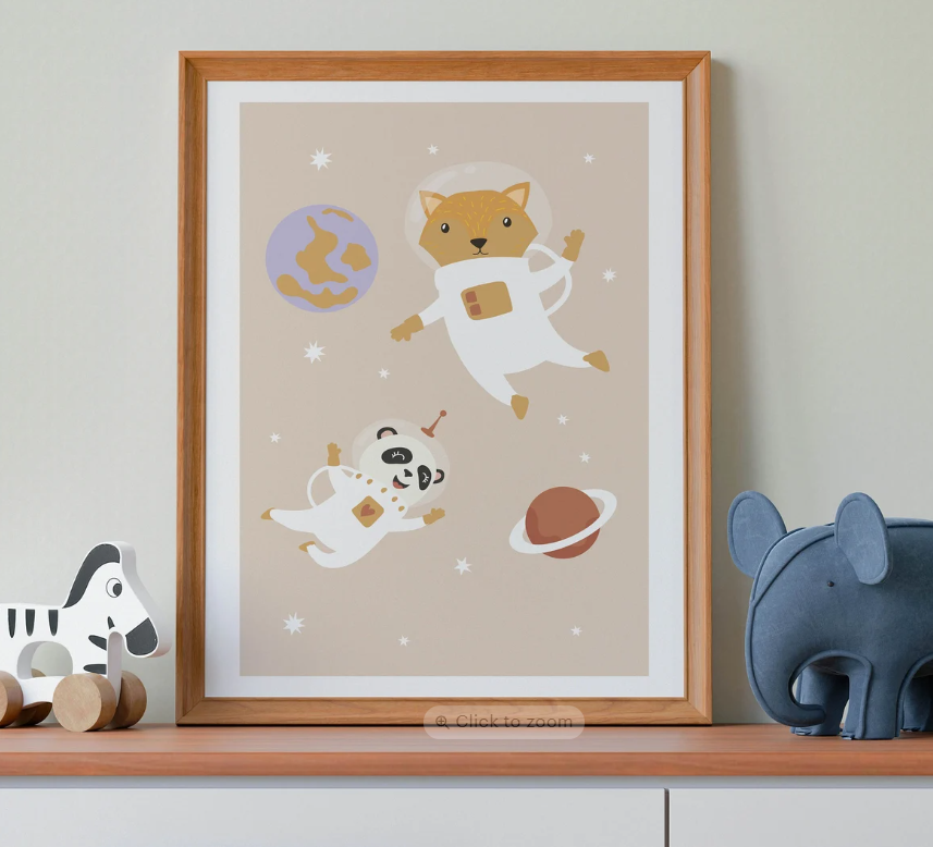 This fox & panda bear astronauts print is an adorable addition to any nursery or playroom. Refresh your child's room decor with this cute space-themed poster or buy it as a gift for new or expecting parents. Perfect for adding character to any room.