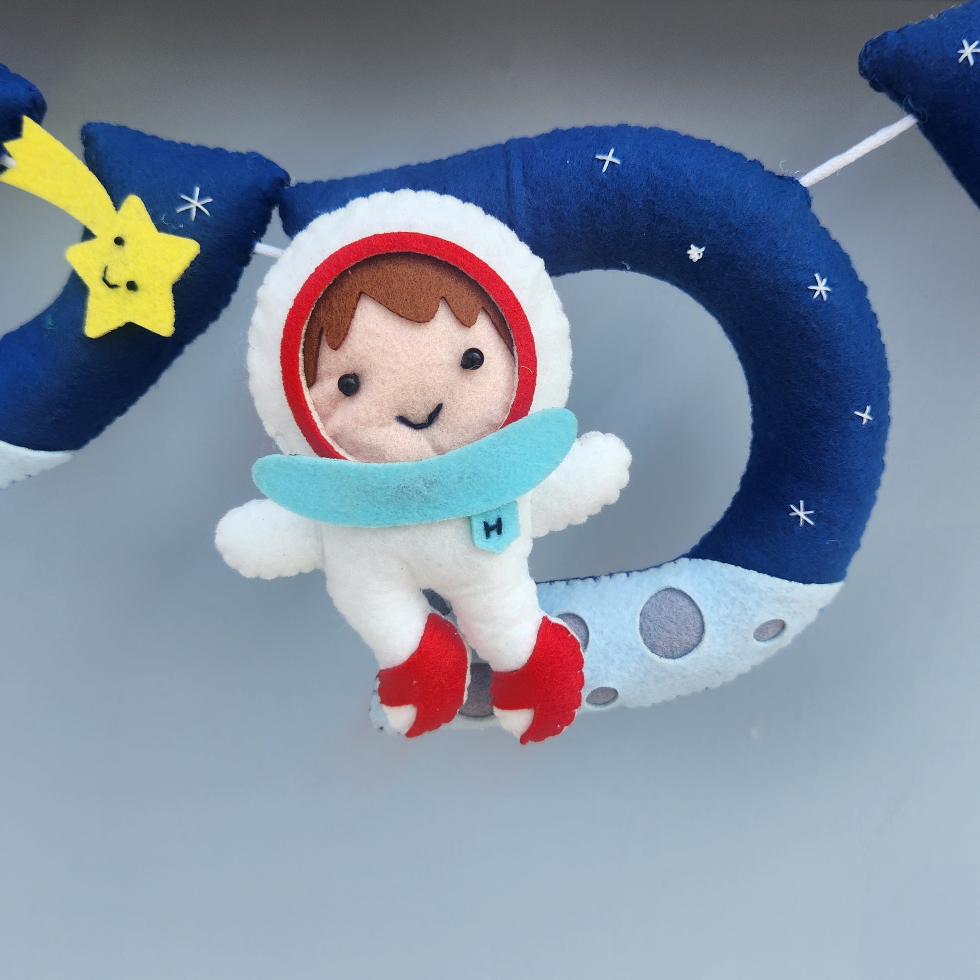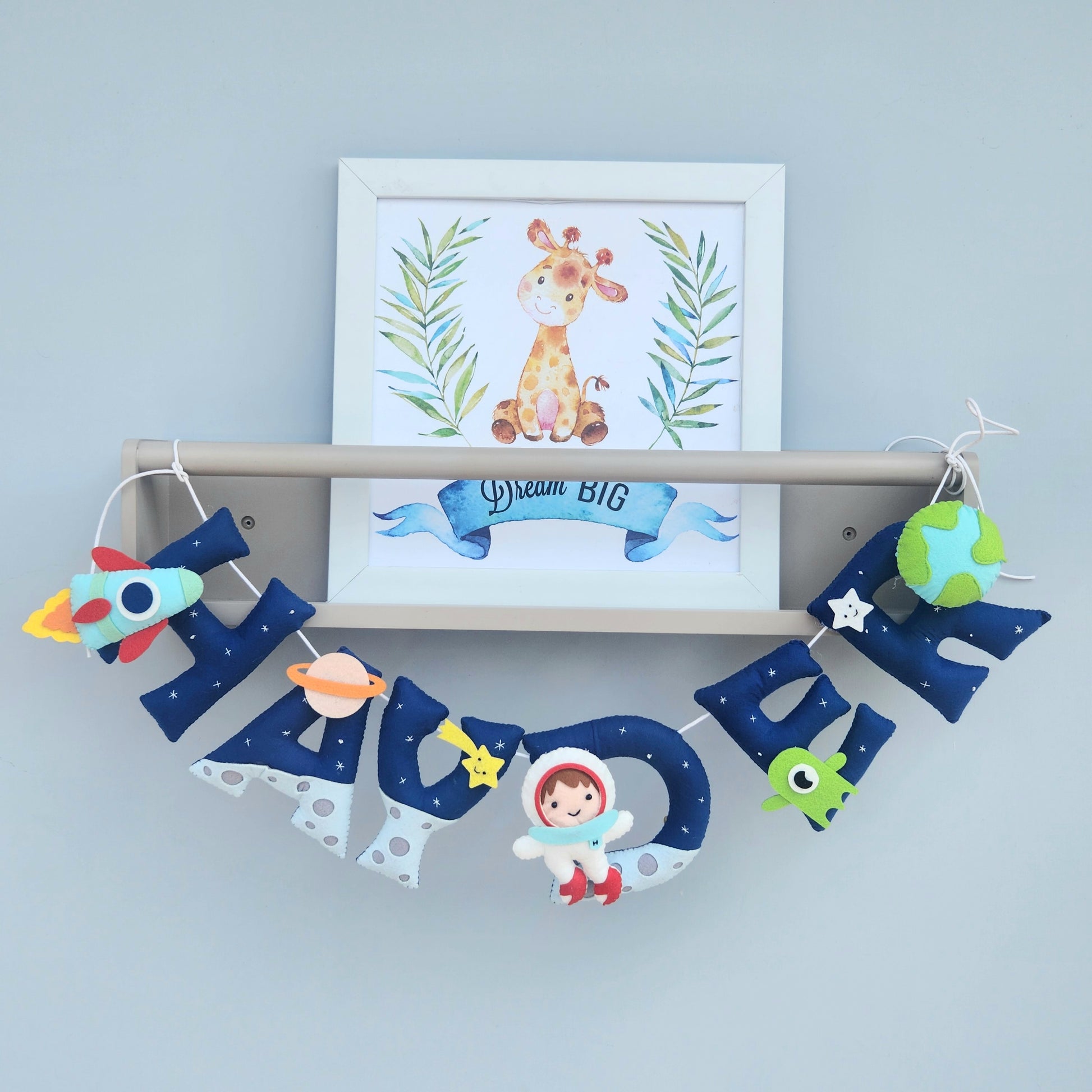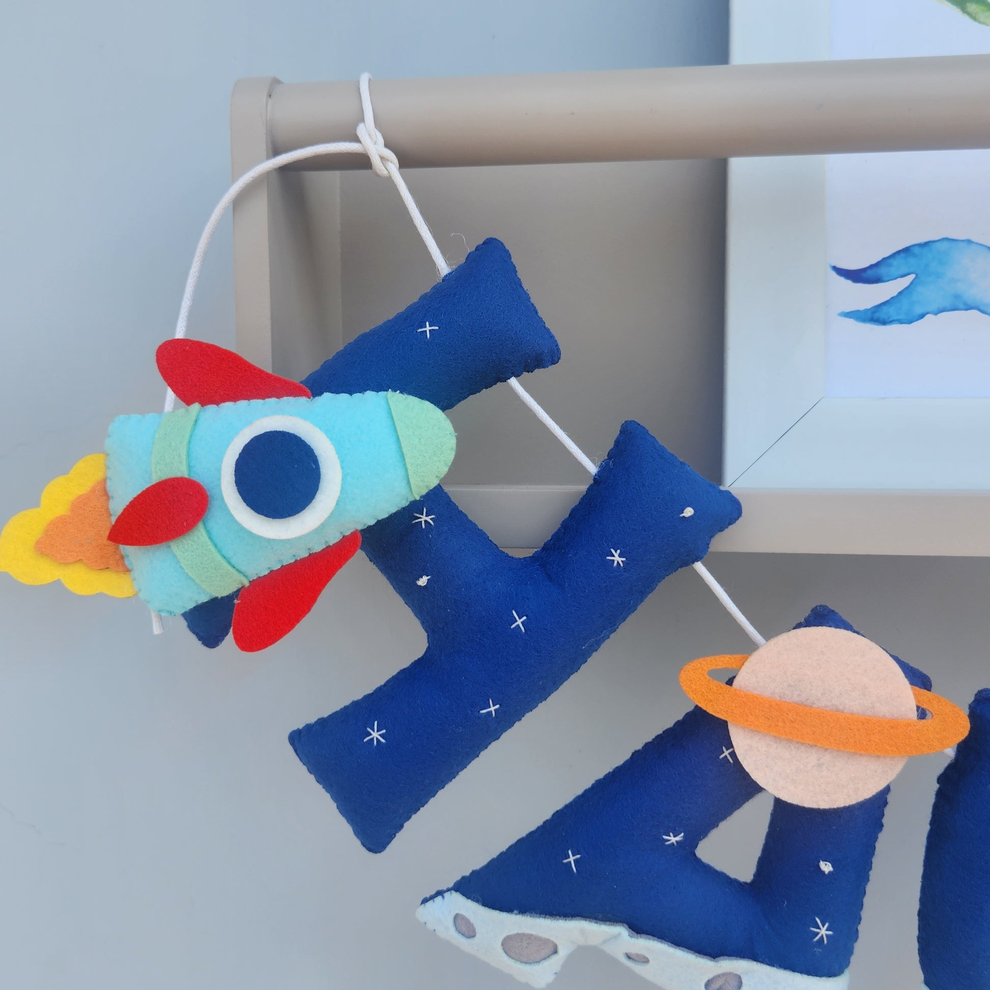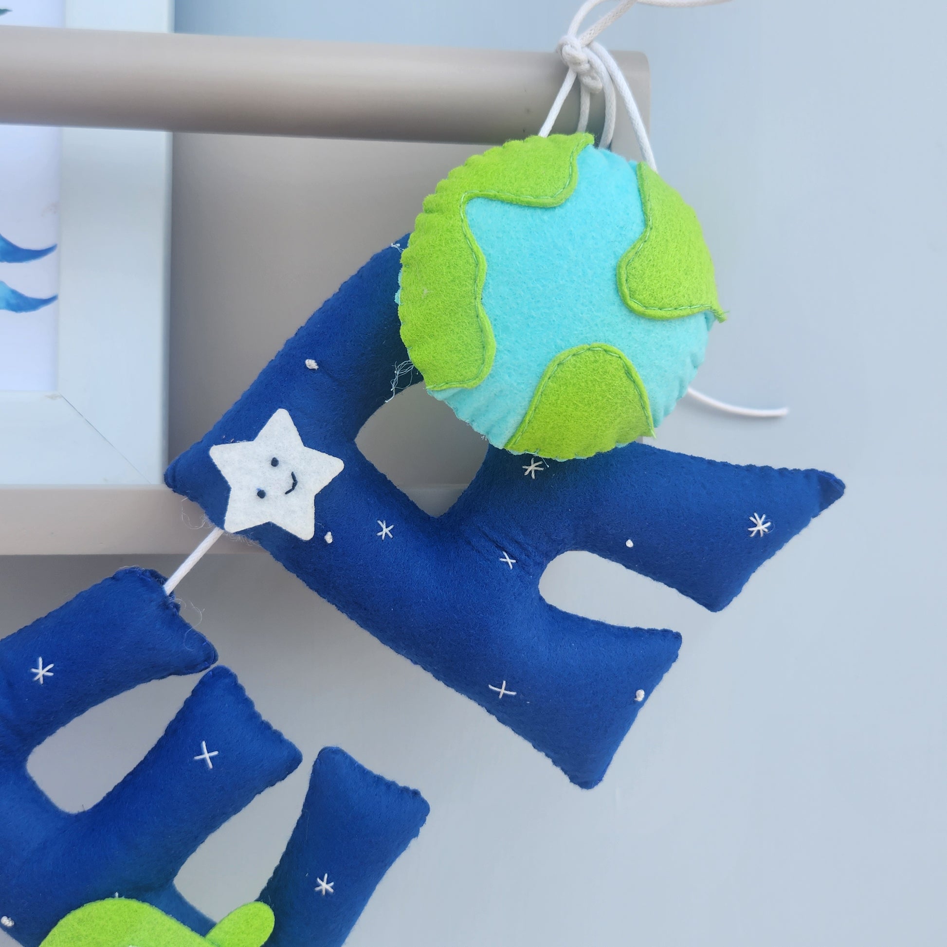 Our personalized space theme name bunting is perfect to hang on a wall shelf or a cot , crib. Can also be used as a birthday banner. These are beautifully handmade.