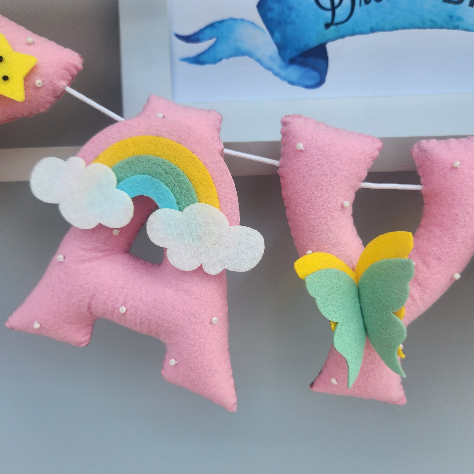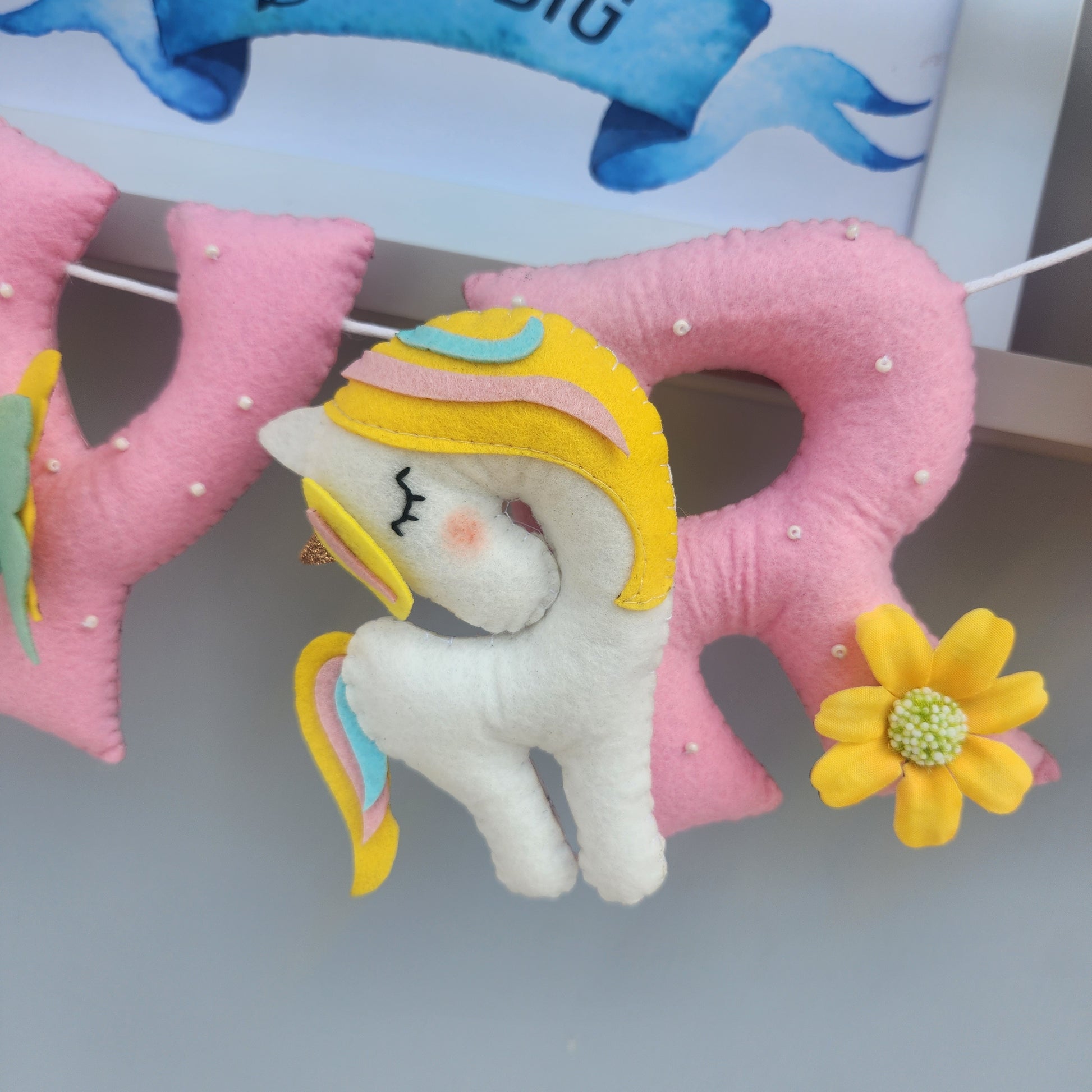 Our personalized unicorn theme name bunting is perfect to hang on a wall shelf or a cot , crib. Can also be used as a birthday banner. These are beautifully handmade.