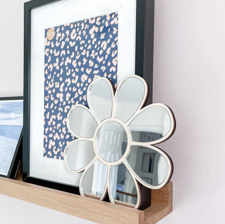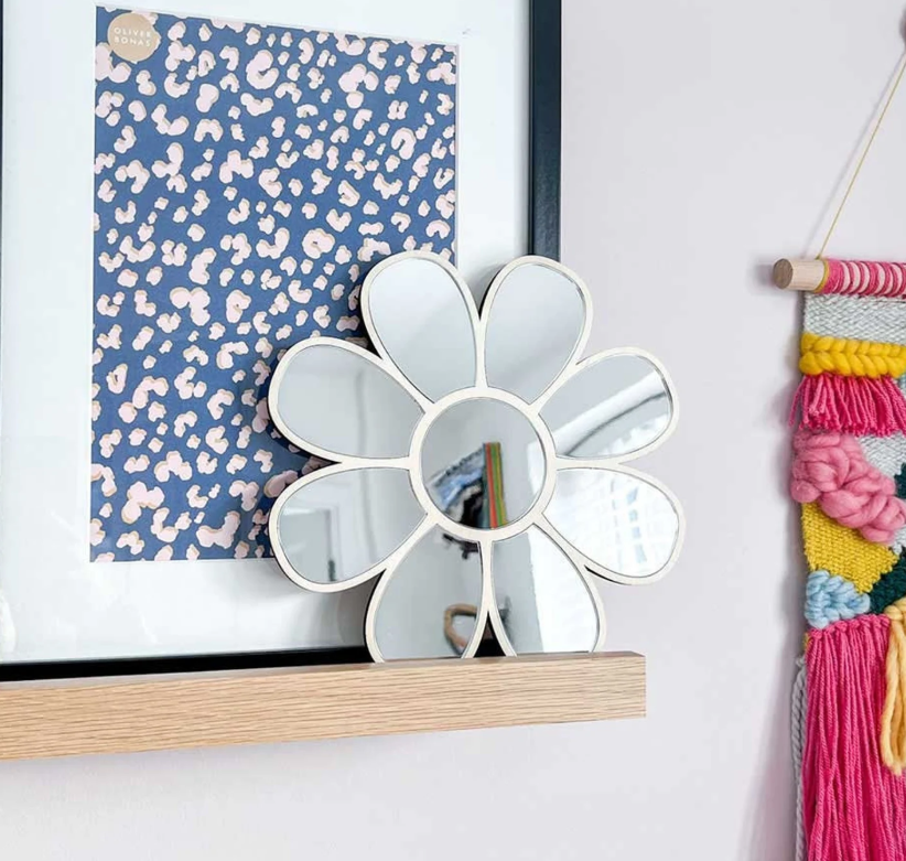 Let your little one's imagination blossom with the kids' flower mirror! This captivating mirror is ideal for adding a sprinkle of nature's beauty to their space and looks fab in any room, nursery, or even for tummy time! It's shatterproof and crafted from mirrored acrylic inset into a plywood frame.